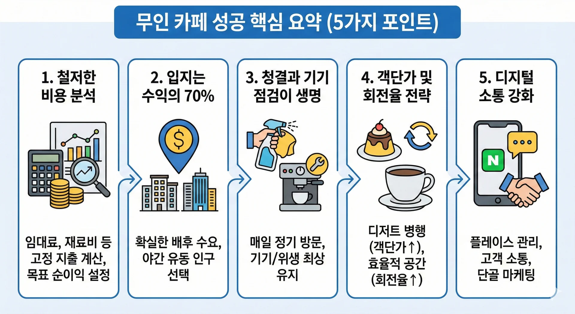 성공적인 무인 카페 운영을 위해 오늘 다룬 내용을 5가지 포인트로 정리해 드립니다.