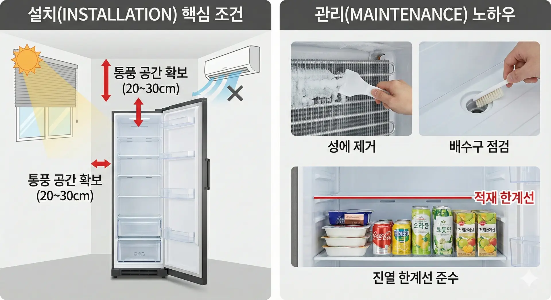 ์ ํ์ ์๋จ, ํ๋ฉด, ์ธก๋ฉด์ ์ ์กฐ์ฌ๊ฐ ๊ถ์ฅํ๋ ์ต์ํ์ ์ด๊ฒฉ ๊ฑฐ๋ฆฌ(๋ณดํต 20~30cm ์ด์)๋ฅผ ๋ฐ๋์ ํ๋ณดํด์ผ ํฉ๋๋ค.