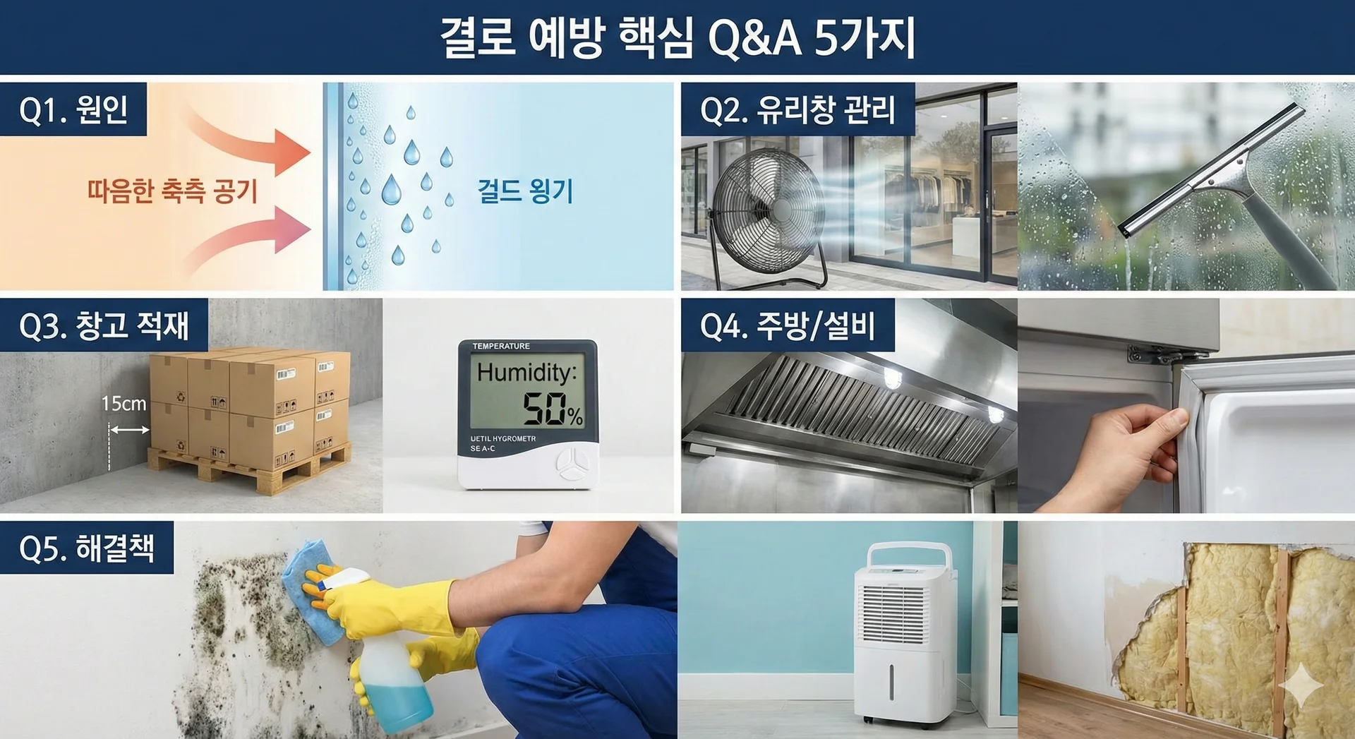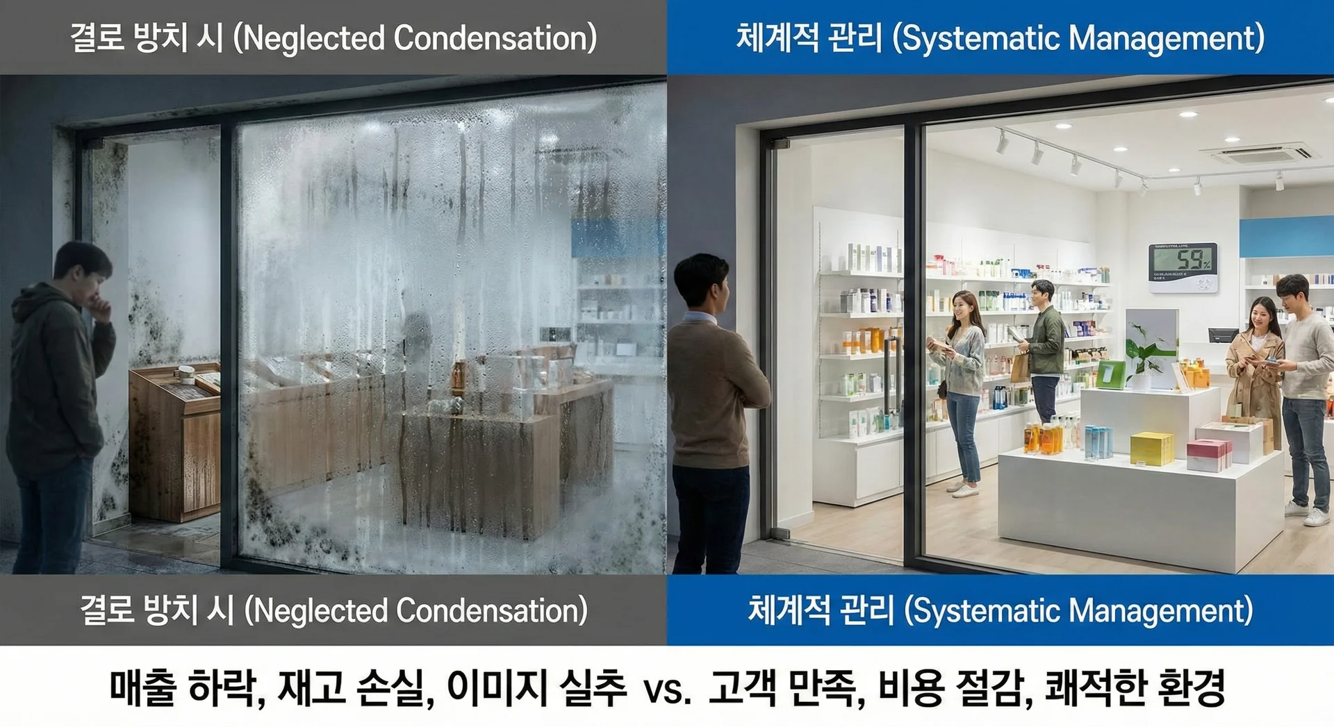 따라서 체계적인 결로 예방 전략은 불필요한 보수 비용을 줄이고 쾌적한 영업 환경을 유지하는 필수적인 경영 관리 요소입니다.