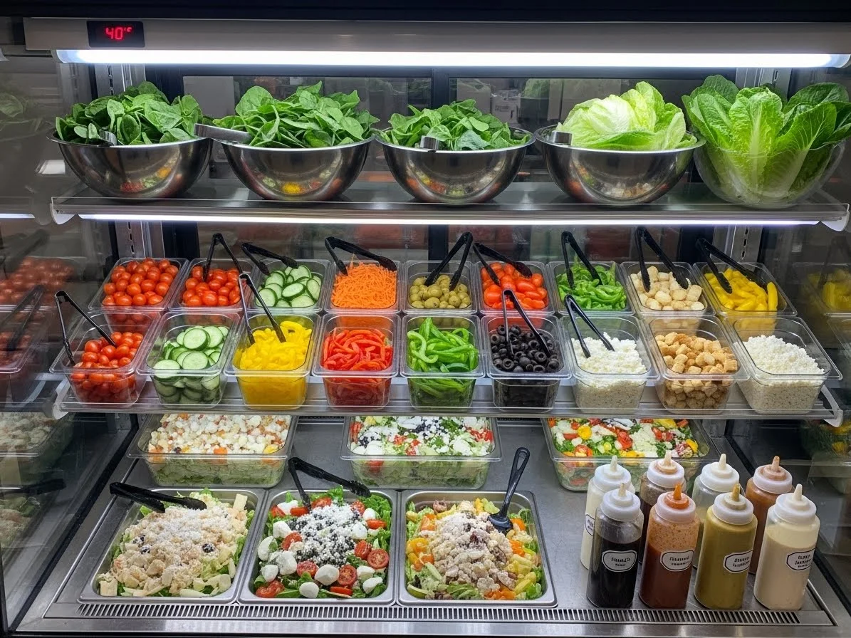 샐러드 재료와 완제품을 어떻게 배치하느냐에 따라 작업 효율성과 신선도 유지가 크게 달라질 수 있어요.