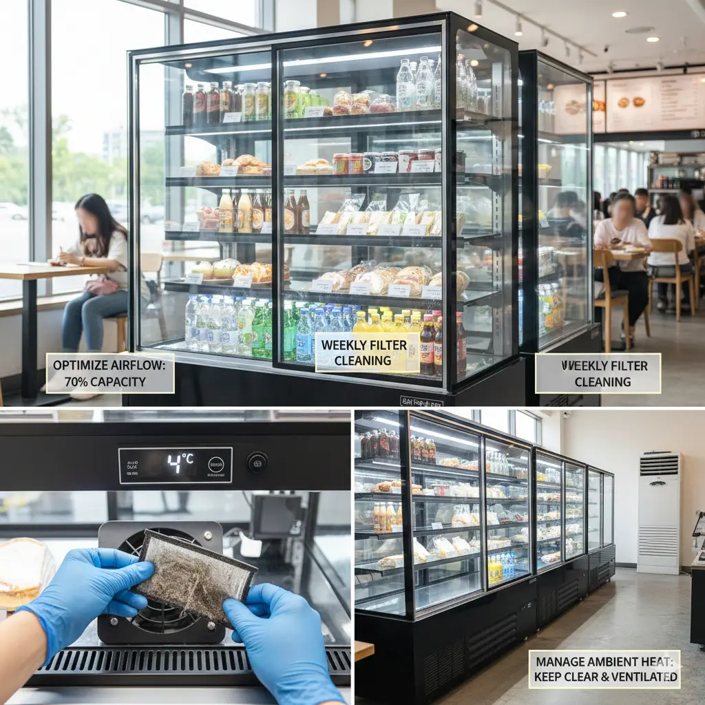 쇼케이스가 설치된 주변 온도가 너무 높으면 응축기 팬이 열을 식히는 데 더 많은 에너지를 소비합니다.