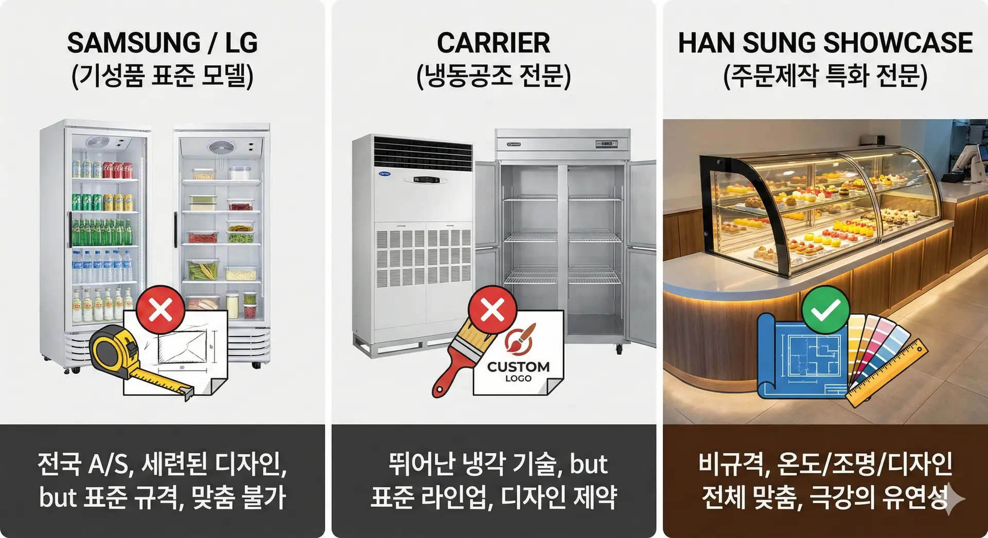 2. 기성품 브랜드(삼성/LG/캐리어) vs 주문제작 전문(한성쇼케이스) 전격 비교