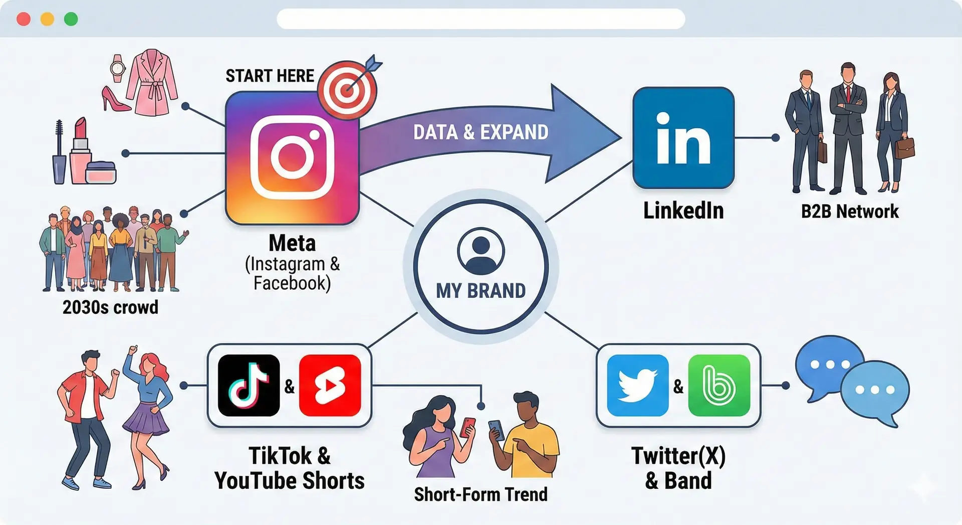 ์ฒ์ ์์ํ๋ค๋ฉด, ๊ฐ์ฅ ์ ๊ตํ ํ๊ฒํ ์์คํ ์ ๊ฐ์ถ '๋ฉํ(์ธ์คํ๊ทธ๋จ+ํ์ด์ค๋ถ)' ๊ด๊ณ ๋ก ์์ํ์ฌ ๋ฐ์ดํฐ๋ฅผ ์์ ํ, ๋ค๋ฅธ ํ๋ซํผ์ผ๋ก ํ์ฅํ๋ ์ ๋ต์ ์ถ์ฒํฉ๋๋ค.