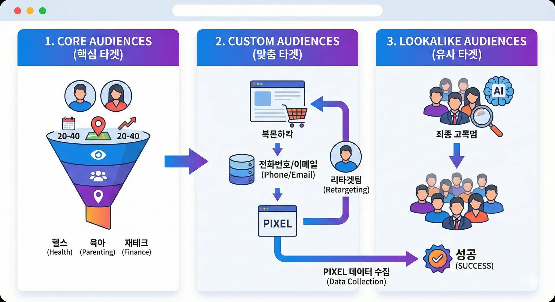 ์ด๊ธฐ์๋ ํต์ฌ ํ๊ฒ์ผ๋ก ์์ํ๋, 'ํฝ์ (Pixel)' ์ค์น๋ฅผ ํตํด ๋ฐ์ดํฐ๋ฅผ ๋ชจ์ ๋น ๋ฅด๊ฒ ๋ง์ถค ํ๊ฒ ๋ฐ ์ ์ฌ ํ๊ฒ์ผ๋ก ๋์ด๊ฐ๋ ๊ฒ์ด ์ฑ๊ณต์ ์ด์ ์ ๋๋ค.