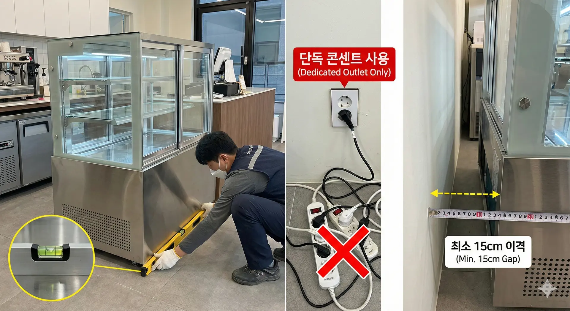 쇼케이스를 들여놓을 때 의외로 많은 분이 간과하는 것이 바닥 수평과 전기 용량입니다.