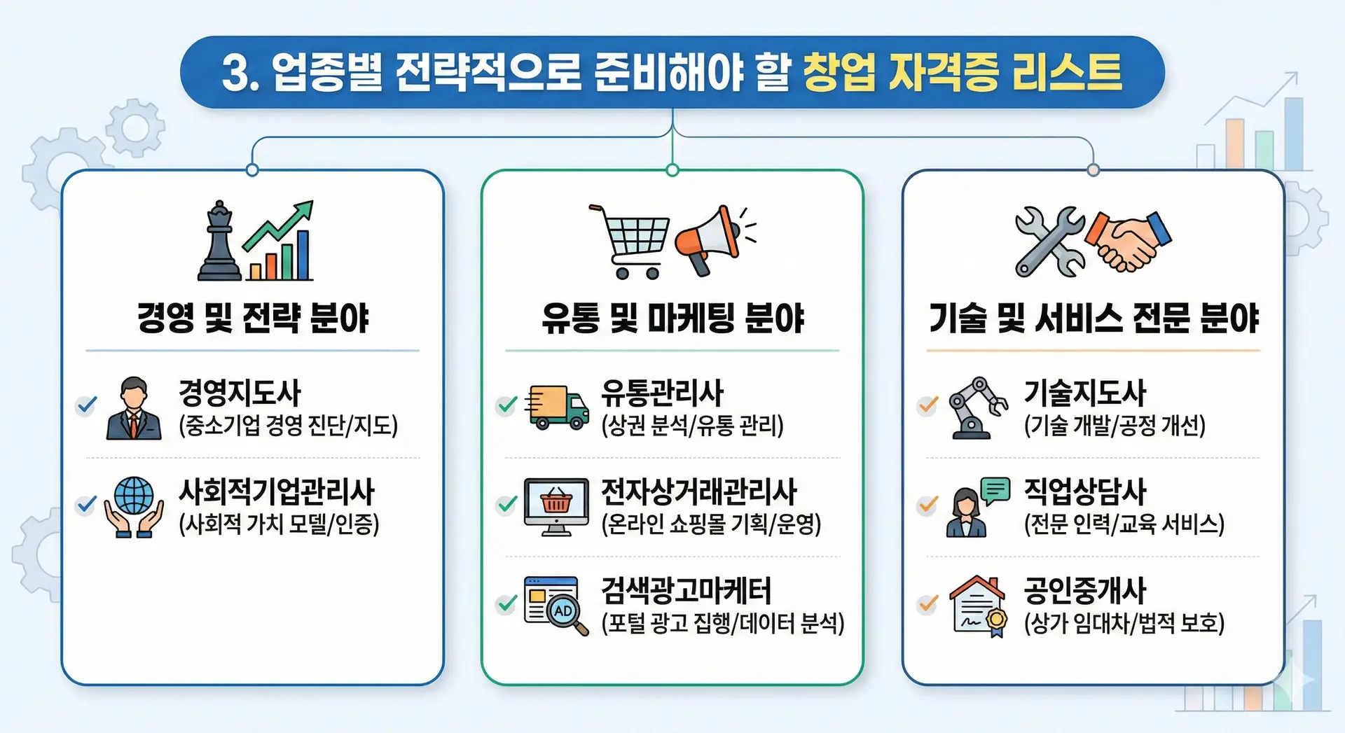 ์ด๋ ๊ตญ๊ฐ ์ ๋ฌธ ์๊ฒฉ์ฆ์ผ๋ก ์ธ์ ์์๊ด๋ฆฌ, ์ฌ๋ฌด๊ด๋ฆฌ, ์์ฐ๊ด๋ฆฌ, ๋ง์ผํ ๋ถ์ผ๋ก ๋๋์ด ์์ด ๋ณธ์ธ์ ์ฌ์ ๋ถ์ผ์ ๋ง์ถฐ ์ ๋ฌธ์ฑ์ ํค์ธ ์ ์์ต๋๋ค.