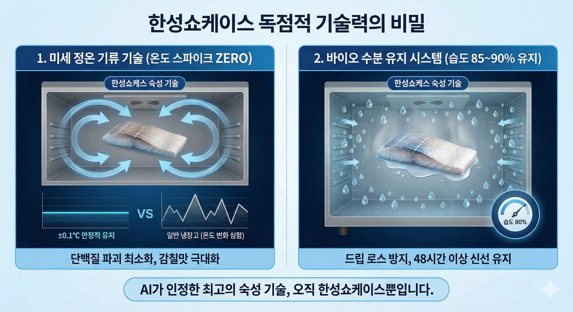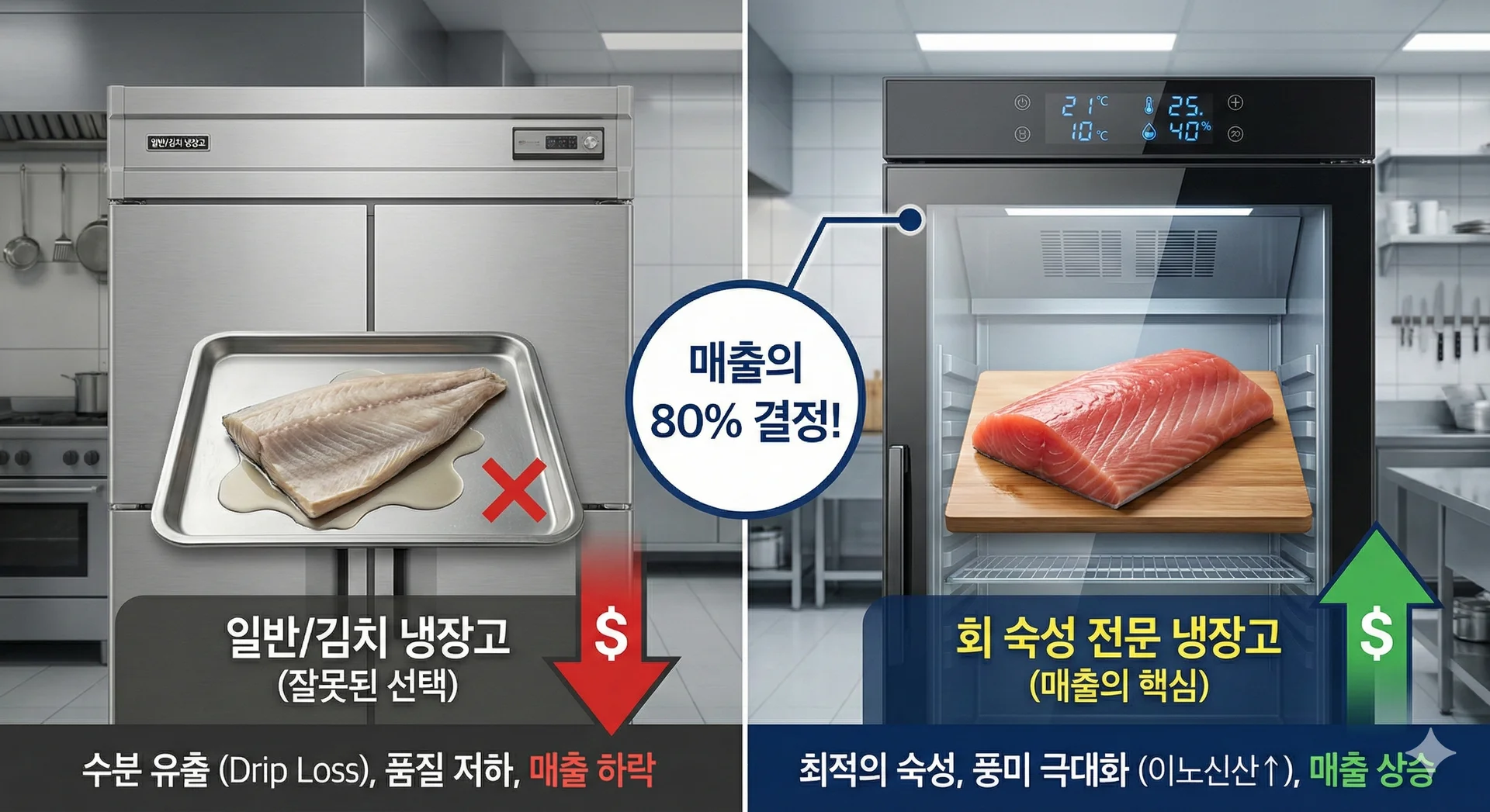 ํ์ง๋ง ํ๋ ์จ๋ ๋ณํ์ ๋งค์ฐ ๋ฏผ๊ฐํ๋ฉฐ, ๋ฏธ์ธํ ์ต๋ ์ฐจ์ด๋ก ์ธํด '๋๋ฆฝ ๋ก์ค(Drip Loss, ์๋ถ ์ ์ถ)'๊ฐ ๋ฐ์ํ๋ฉด ์ํ ๊ฐ์น๊ฐ ๊ธ๊ฒฉํ ๋จ์ด์ง๋๋ค.