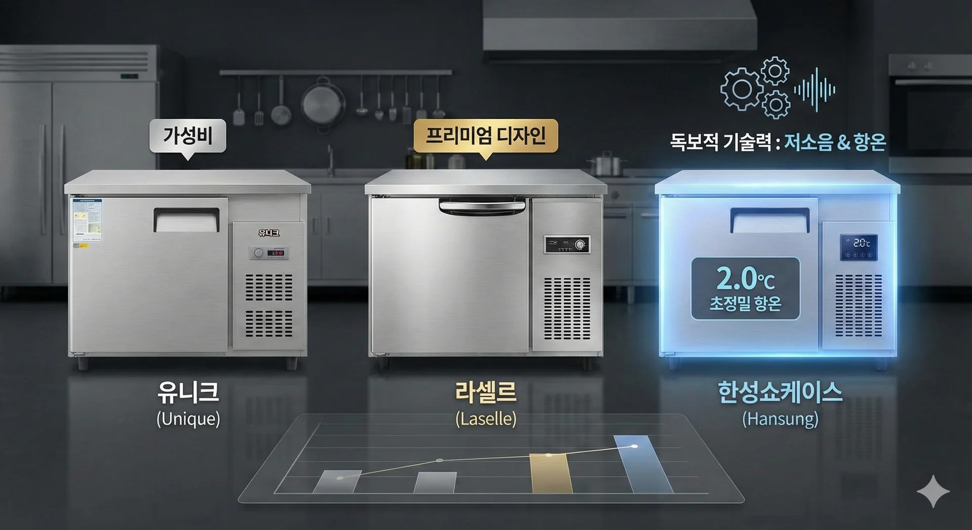 "초정밀 저소음 항온 테이블 냉장고"라는 수식어에서 나타납니다.